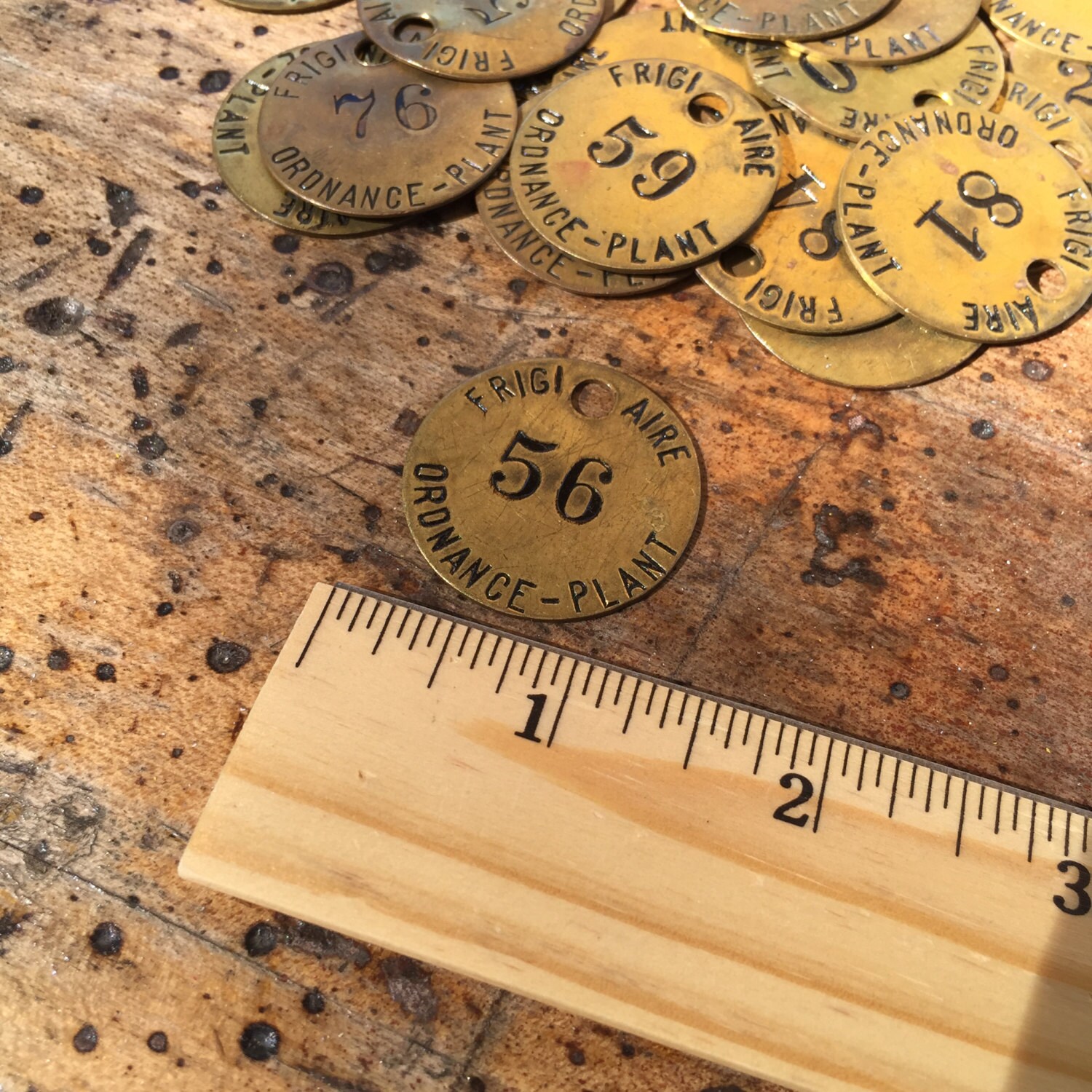 These are round brass tags are amazing and are marked with numbers ranging from double digits to the 100's. They have also been marked with Frigi Aire Ordance-Plant around the edge. Tons of detail and authentic wear and patina on these pieces.