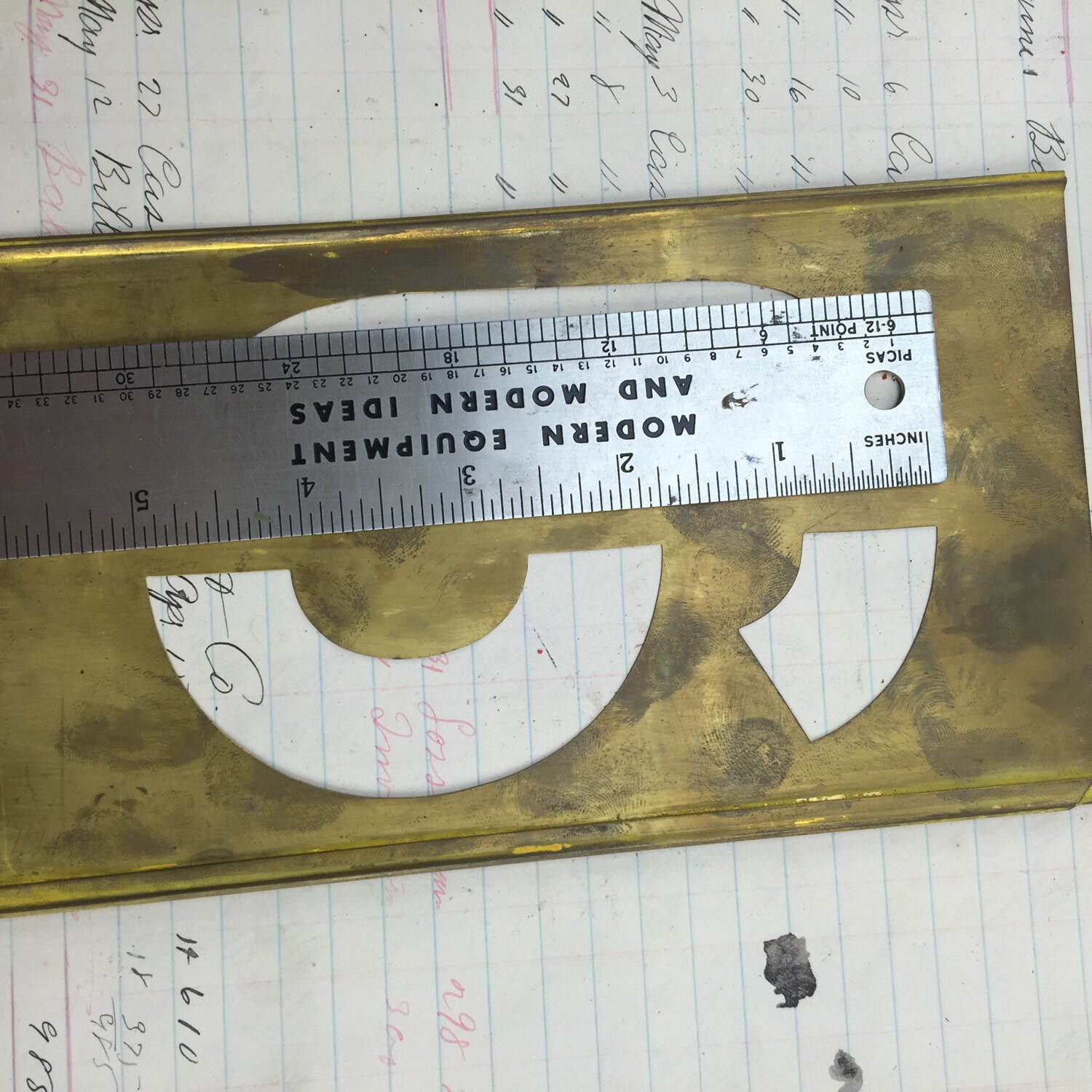 Character cut in the brass plate is approximately 5" tall while the overall stencil measures 7" tall. See last photo for sizing.