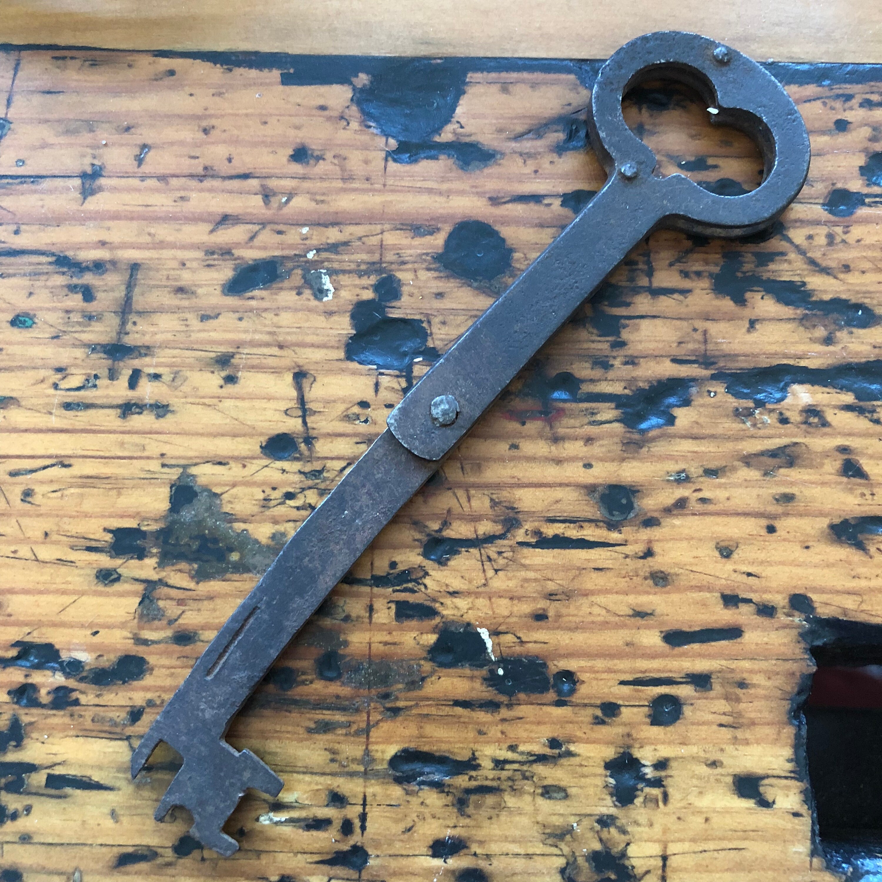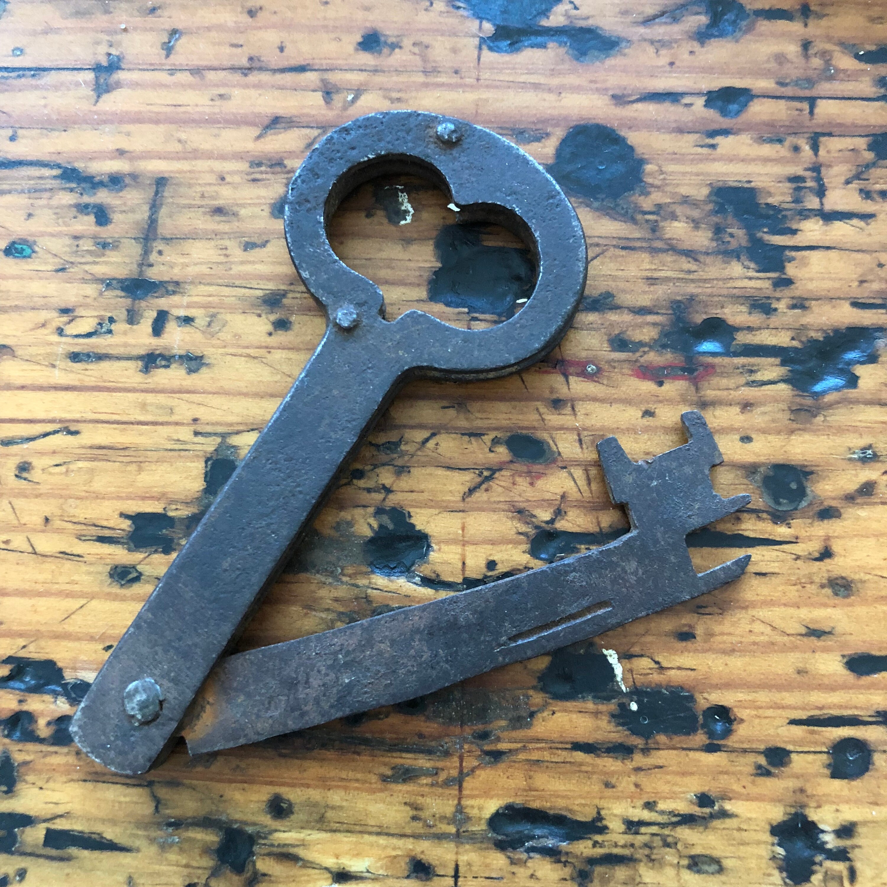 Very interesting authentic folding skeleton key. Unique hinged skeleton key folds up to fit easier in your pocket. Heart shaped hole
